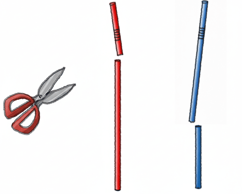 ①ストロー3色×各5本を上から2/3の長さに、残り各5本を上から1/3の長さにはさみで切ります。