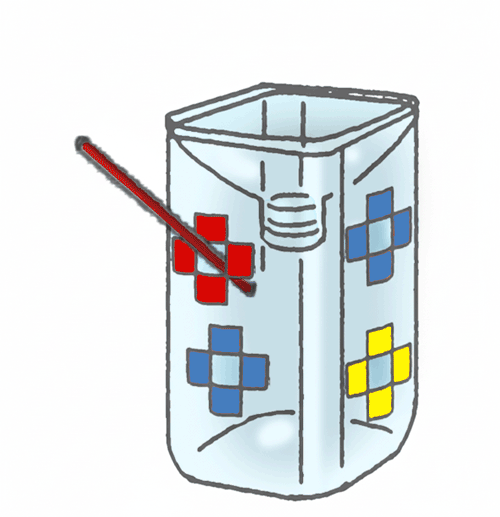 ③カッターで1.5センチ幅の四角い穴を、10ヵ所ほど開け、1つの穴のまわりに1つの色のビニールテープを貼ります。