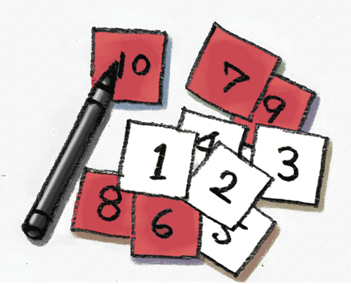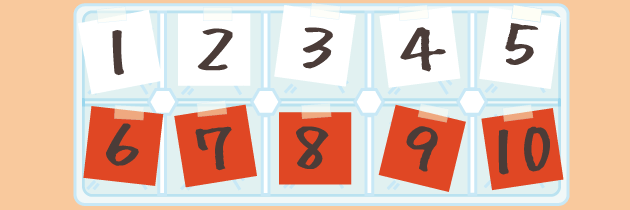 ①白色の紙に1から5までの数字を、赤色の紙に6~10までの数字を書きます。