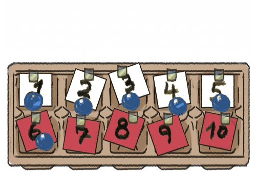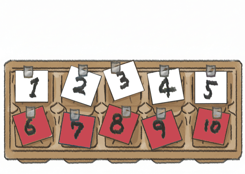 ※慣れたら、卵ケースをもう1つ用意して11~20の数字を貼って、数を増やすといいでしょう。10進法を教えるのに役立ちます。